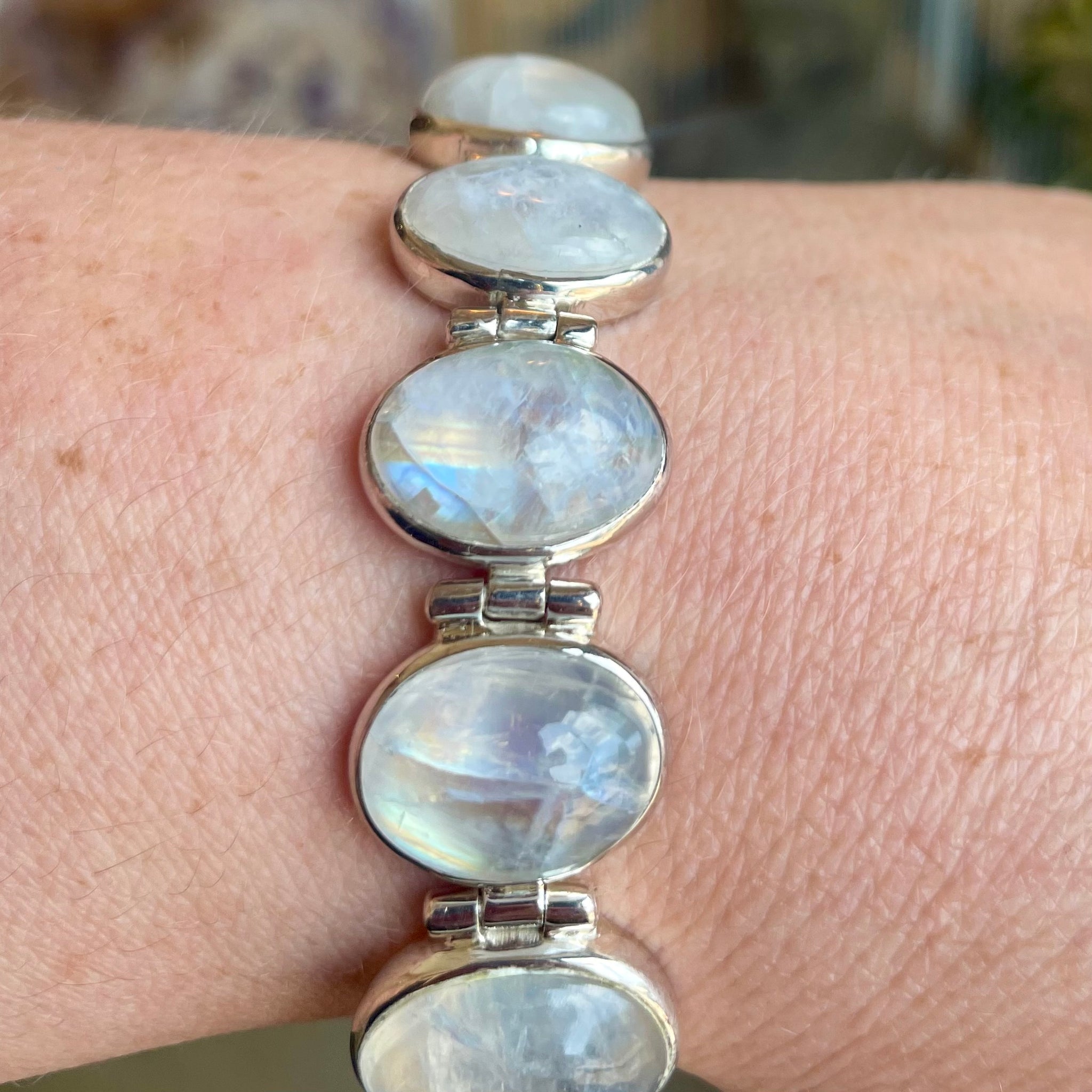 10 stunning iridescent Rainbow Moonstone cabochons adorn this Tibetan Sterling Silver bracelet for a rush of feminine power and soothing protection. 7 inches in length.
