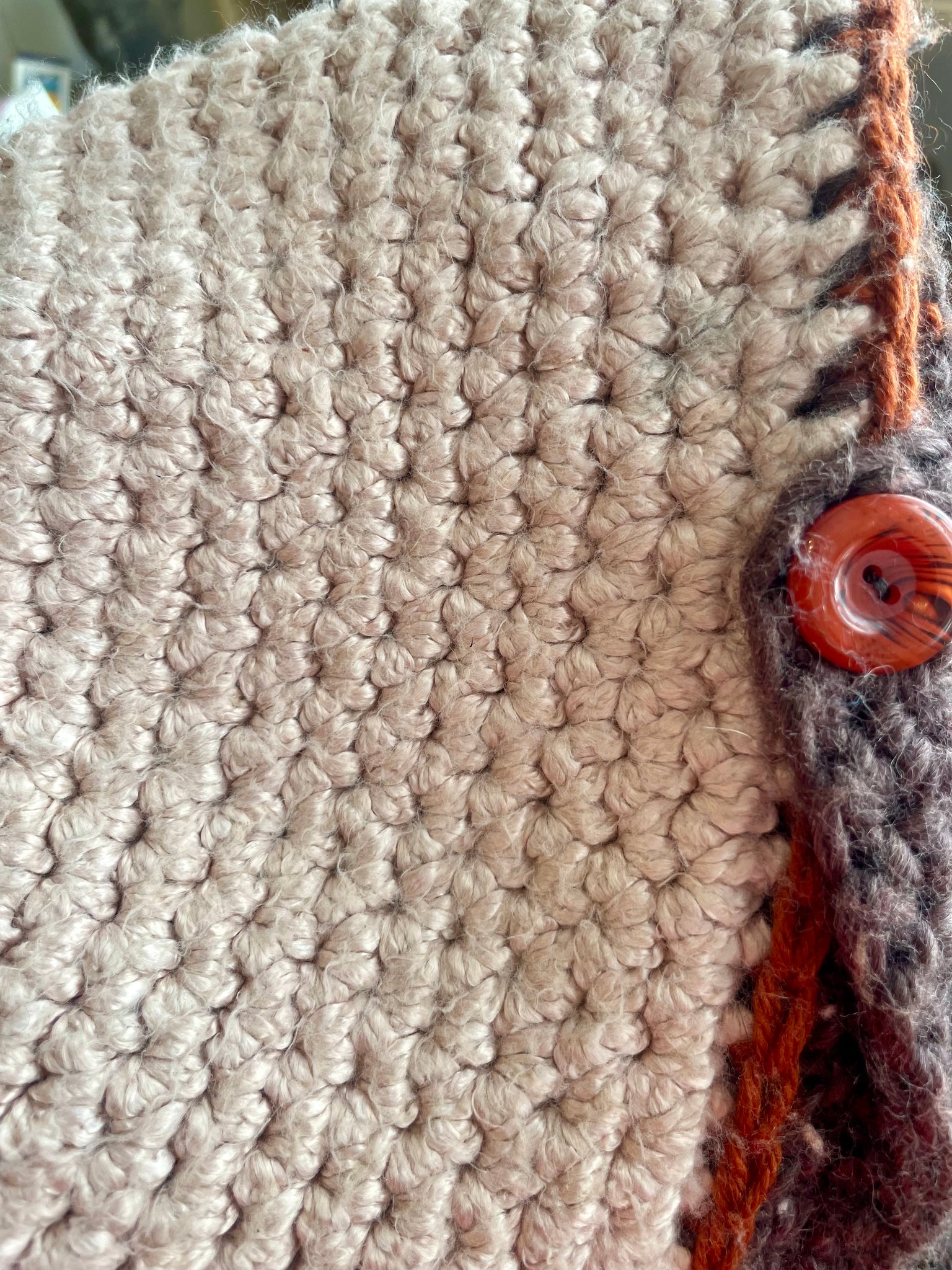 Fuzzy Blush Pink with a Brown stripe.