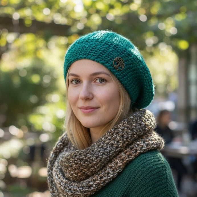 Tree of Life Embellishment, Emerald Green Slouch Beanie. Handmade By Wojo!