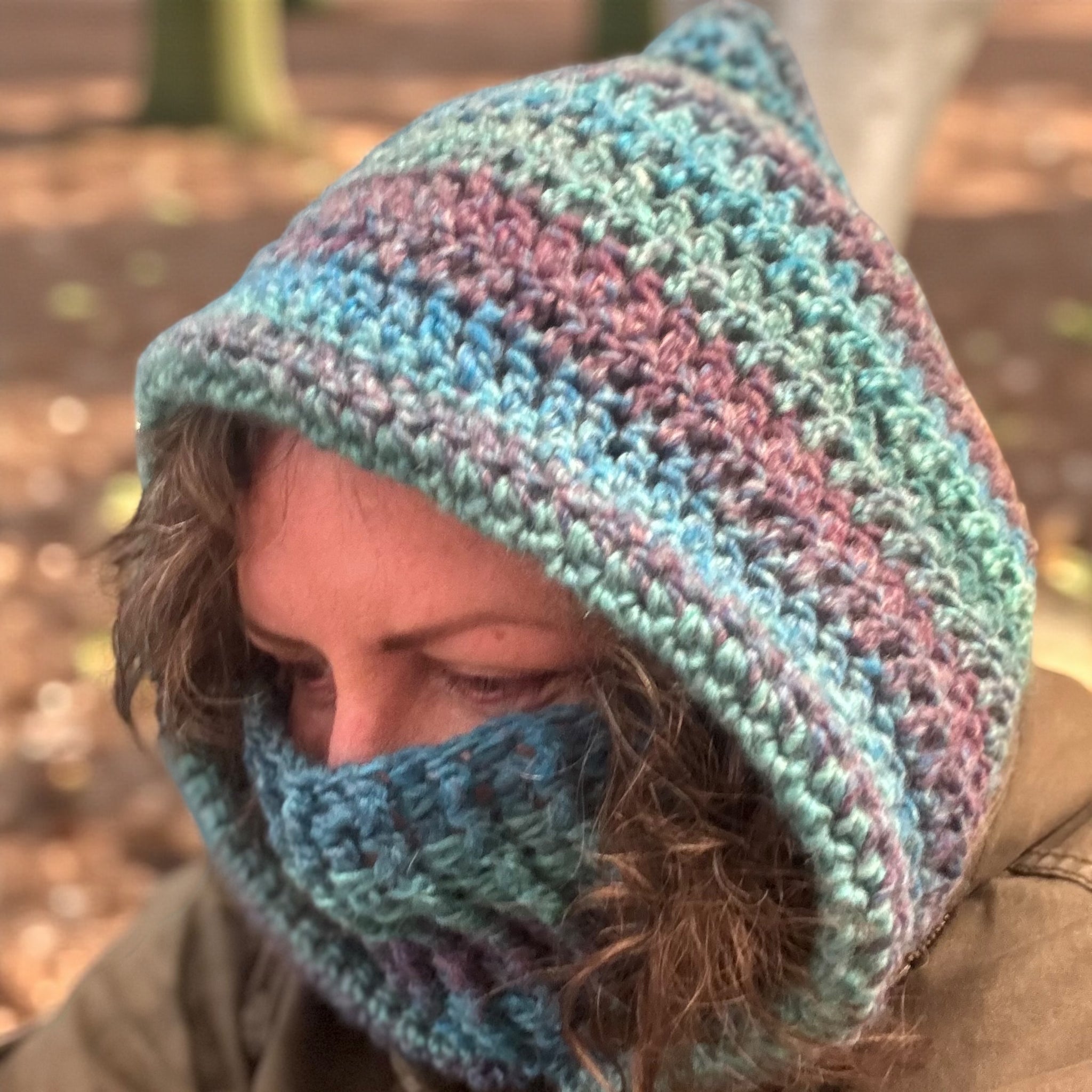 Crochet Hood Scarf - Face Warmer- blue,green, purple rainbow