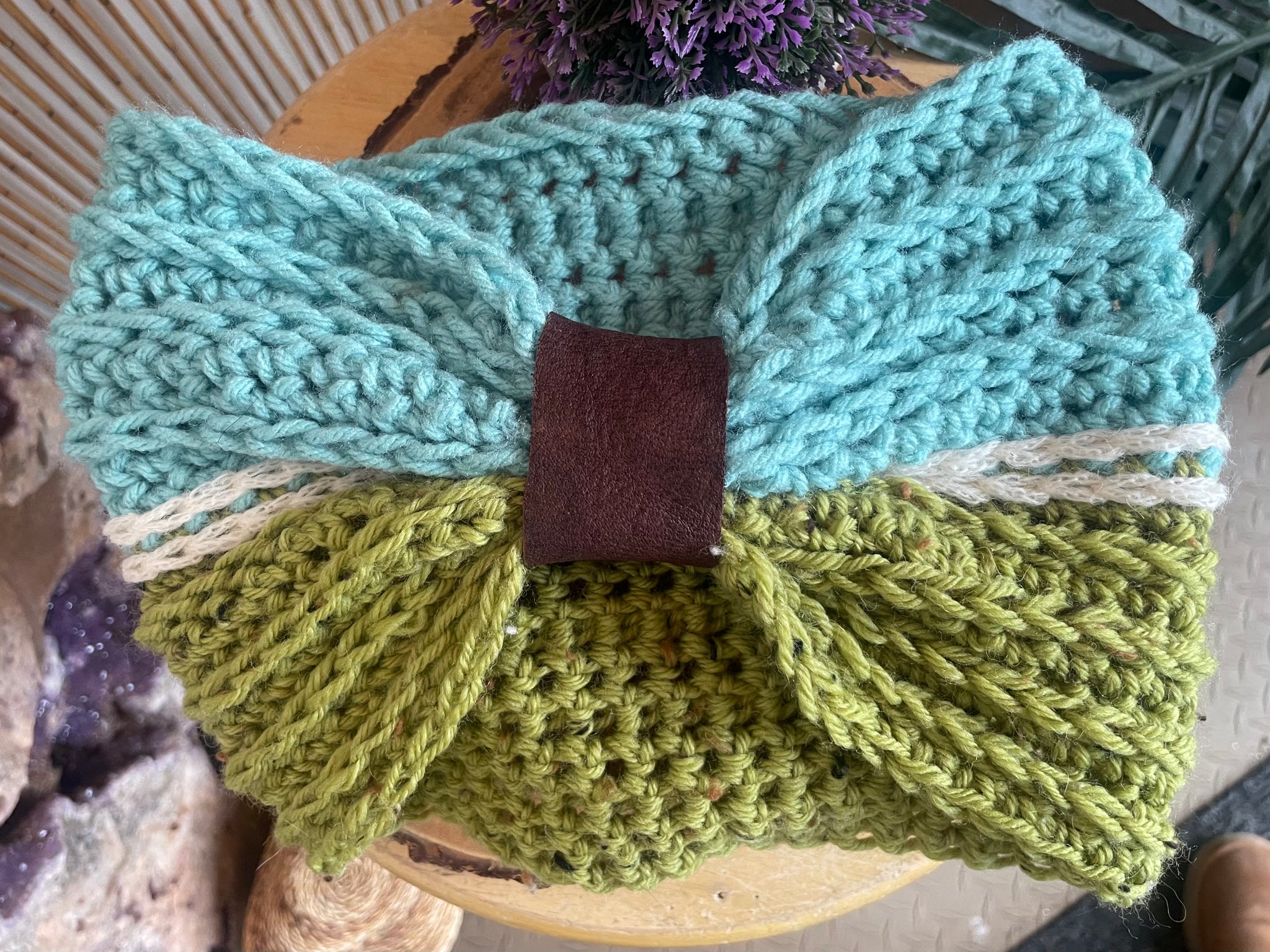 Crochet ear warmer headband, bound with leather to create a cute scrunched look you can wear at the front or at the back!