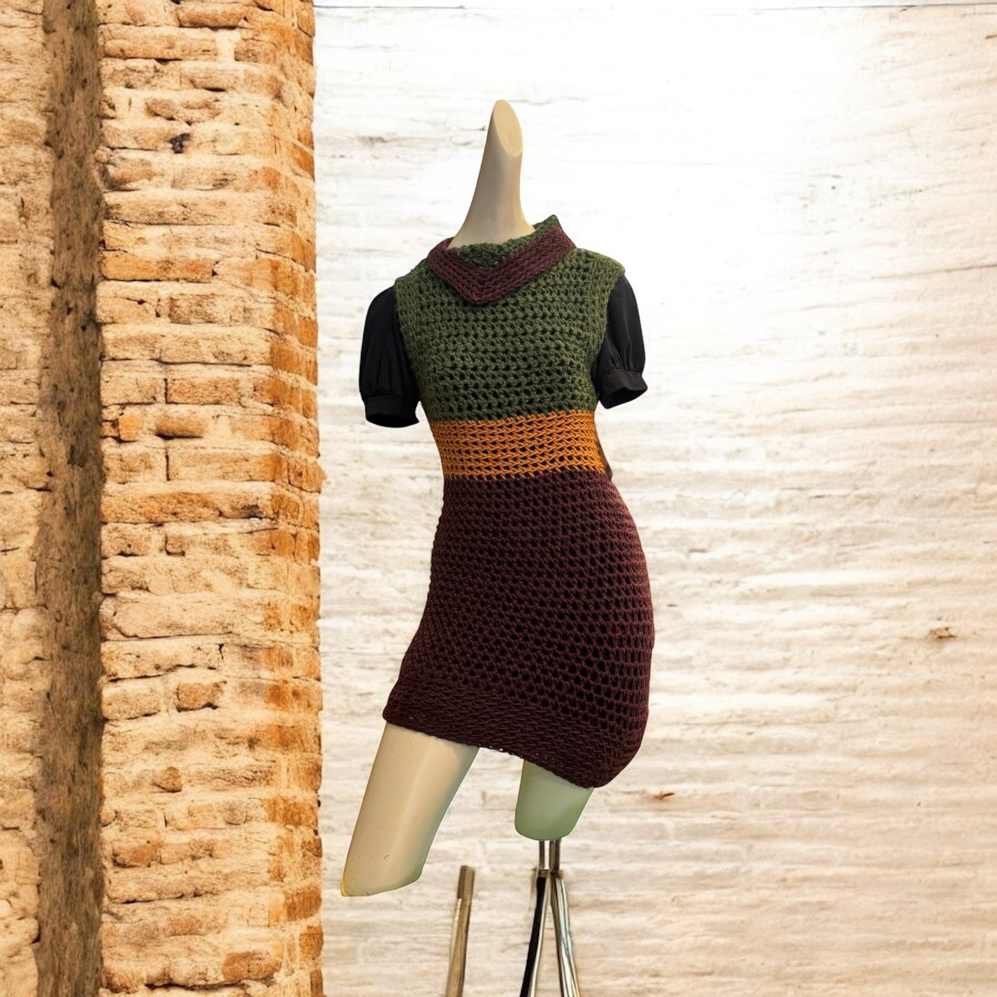 Crochet Tunic Dress * - Green, Mustard and Maroon Colour Block- Size Medium