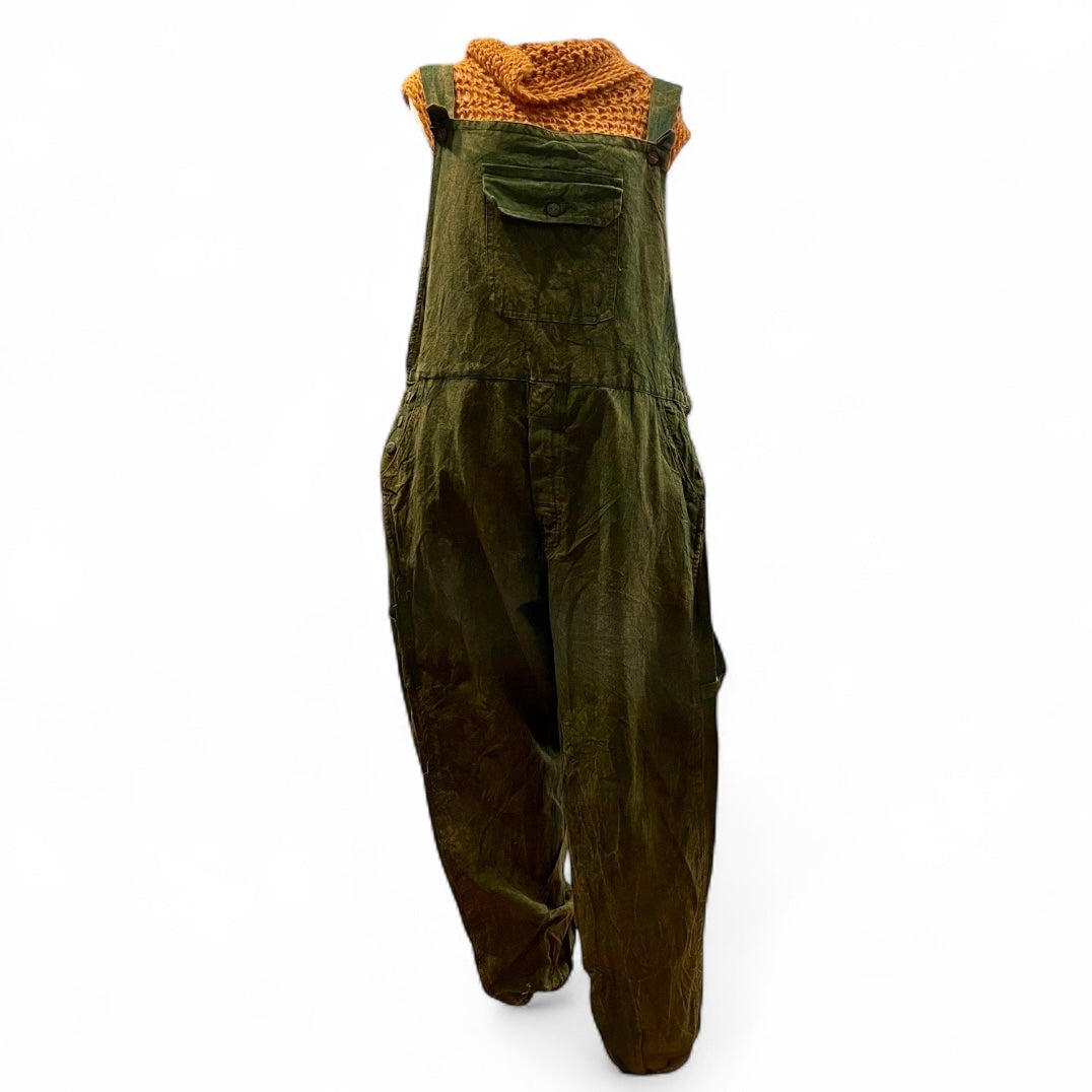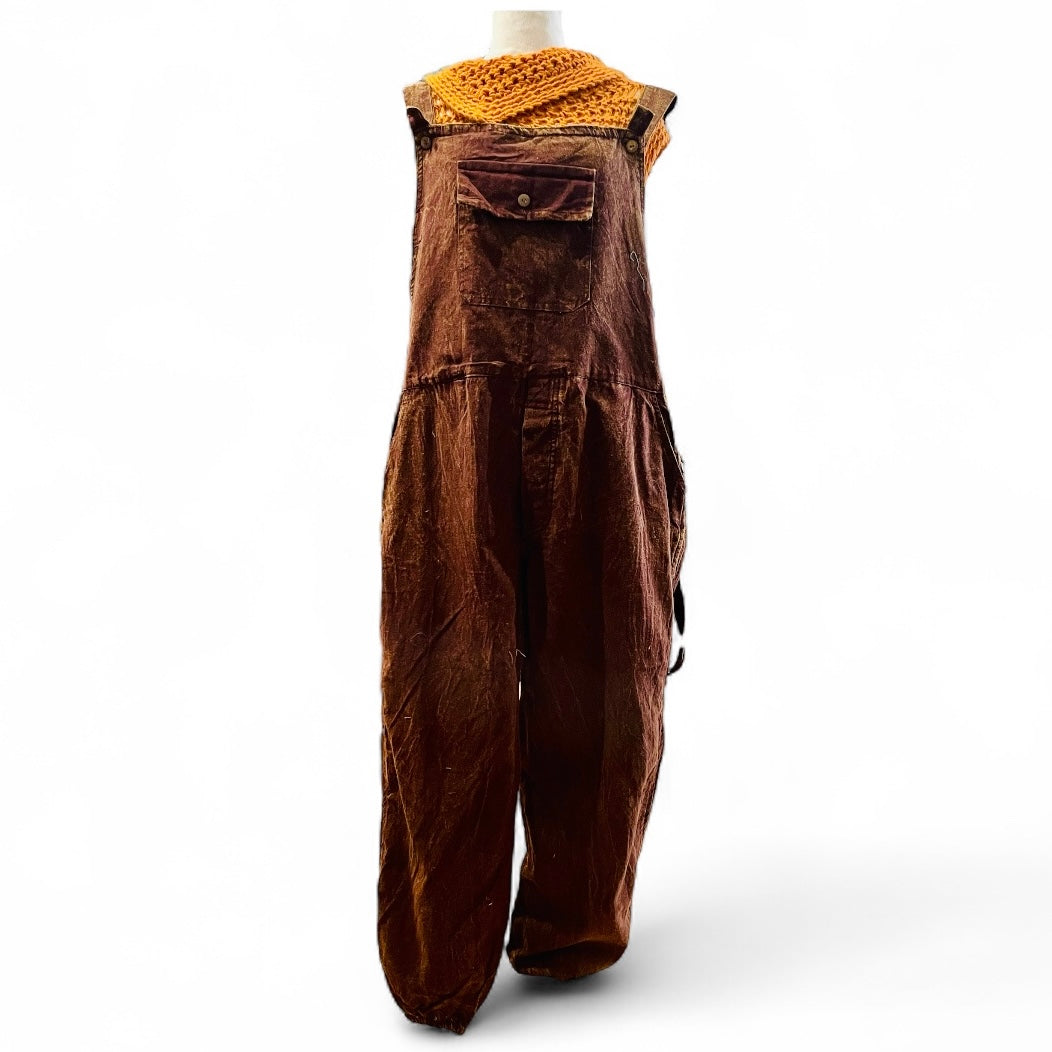 Similar to a denim but light weight.100% Cotton, made in Nepal. Acid Wash overalls, jogger bottoms -elastic cuff.