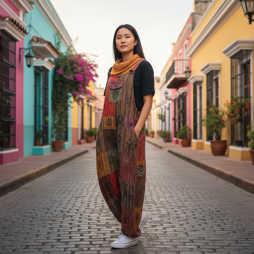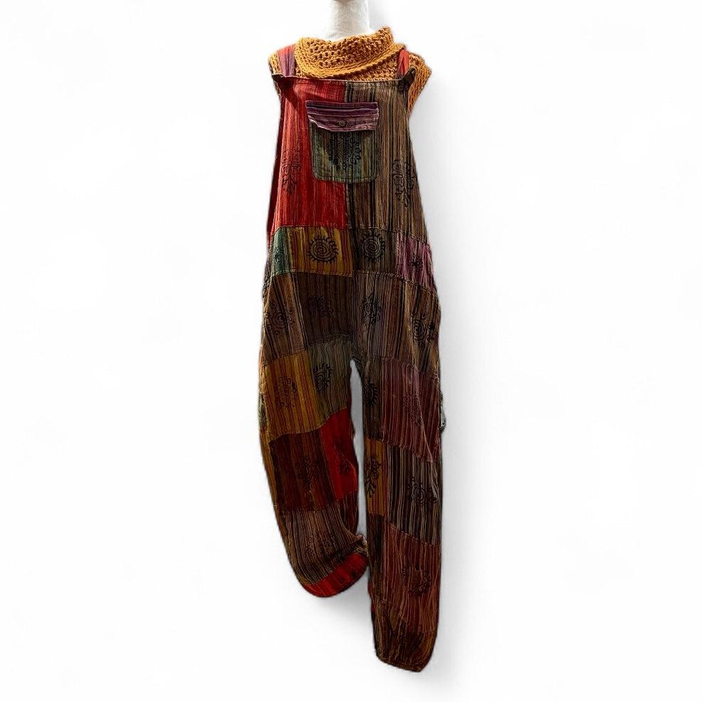 Funky patchwork designs and organic cotton with natural dyes. Elastic waistband and leg cuffs. Loose fit but no stretch.