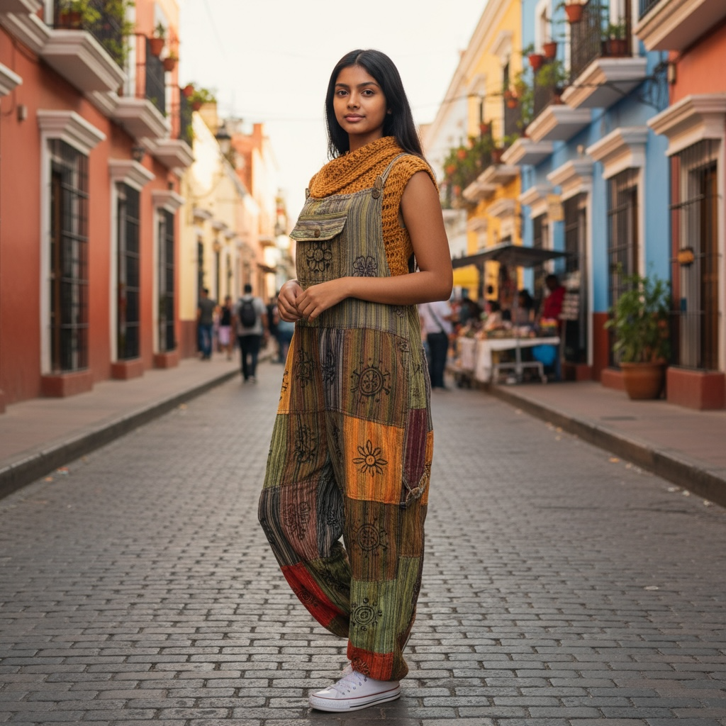 100% cotton, made in Nepal. Funky patchwork designs and organic cotton with natural dyes. Elastic waistband and leg cuffs. Loose fit but no stretch.