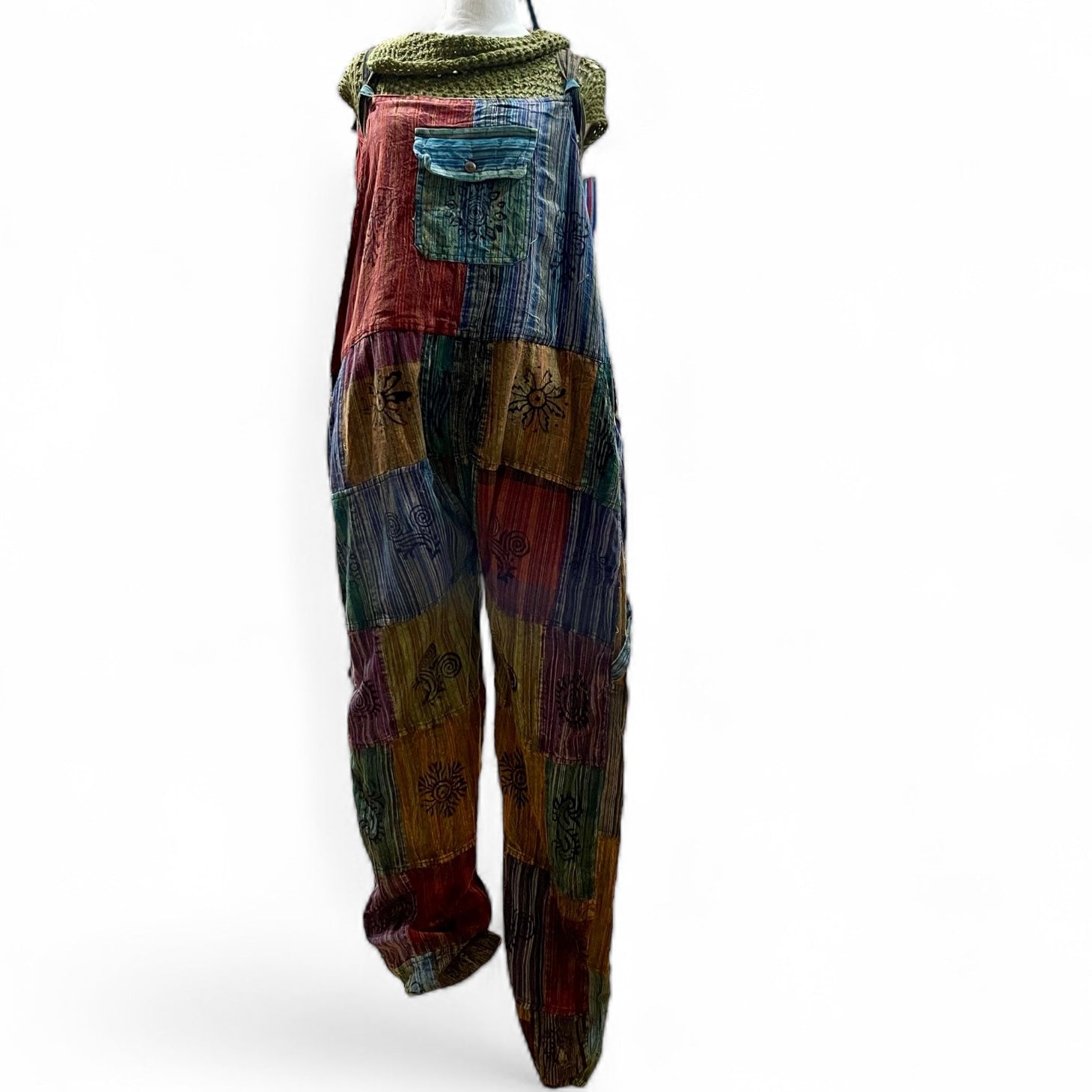 100% cotton, made in Nepal. Funky patchwork designs and organic cotton with natural dyes. Elastic waistband and leg cuffs. Loose fit but no stretch. Crochet top not included*. But it is made by the Owned, Vanessa! Check out our Crochet selection.