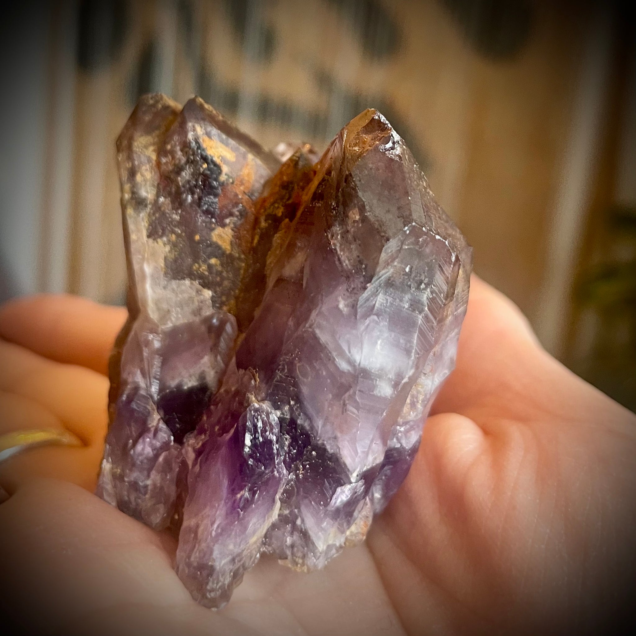 These are local, naturally terminated Amethyst clusters with all the signatures of auralite. Look for the stunning layers, the red hues of hematite and the deep midnight purple colour.