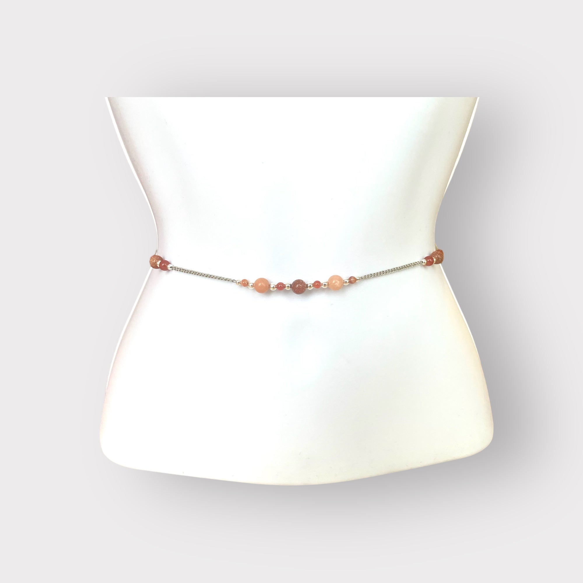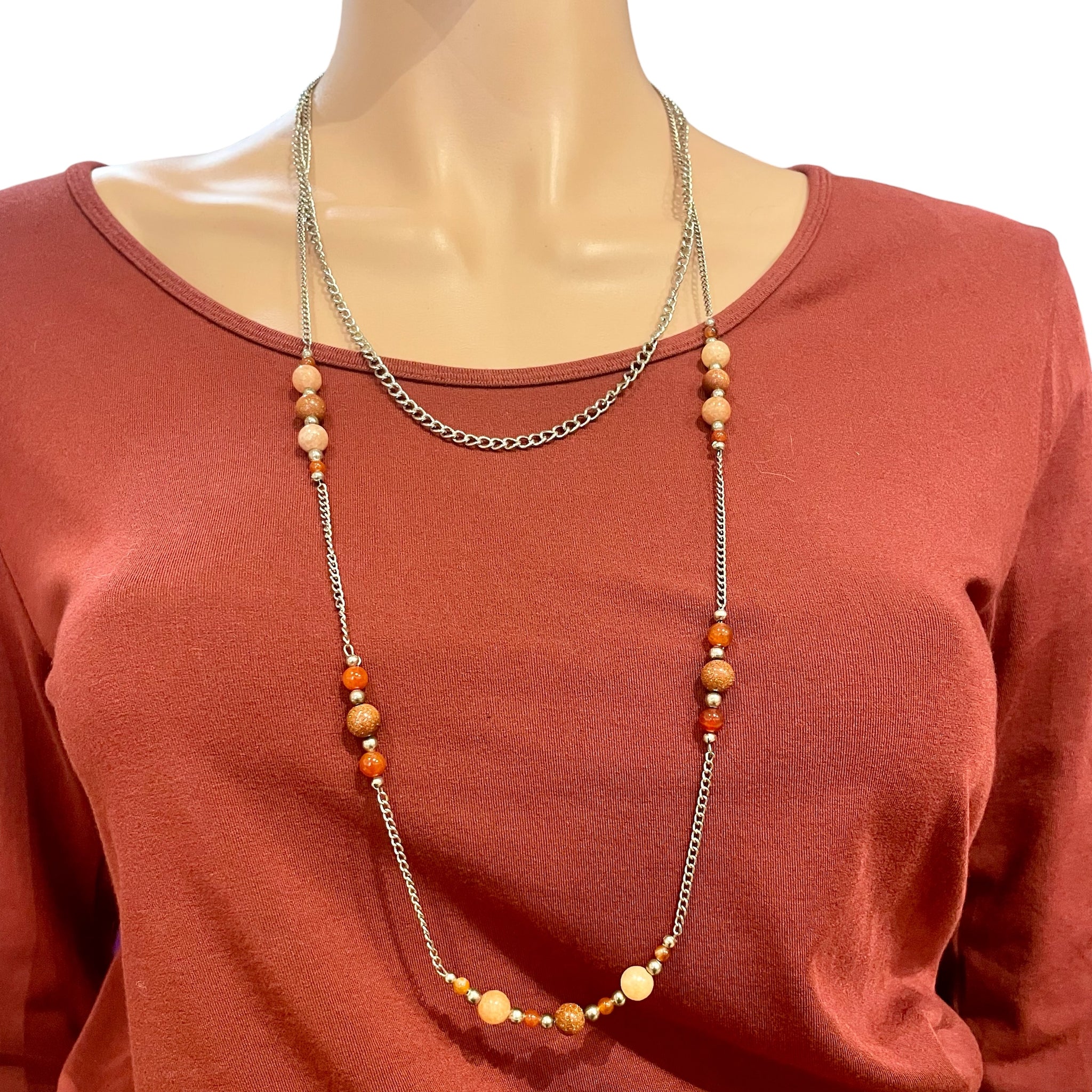 This beaded chain has beads of sunstone and goldstone, sized 35”-55”.
