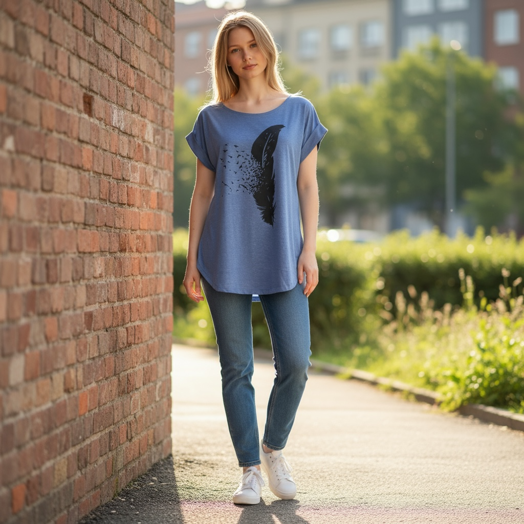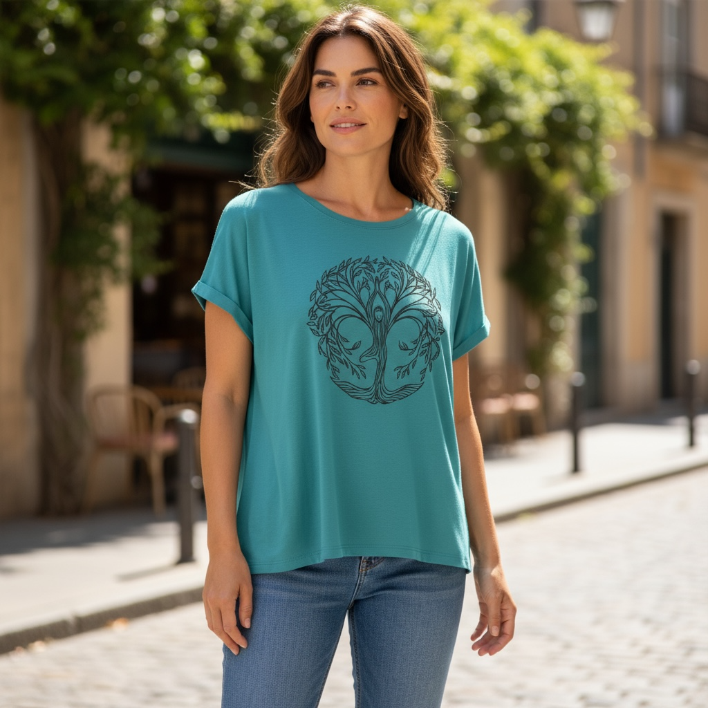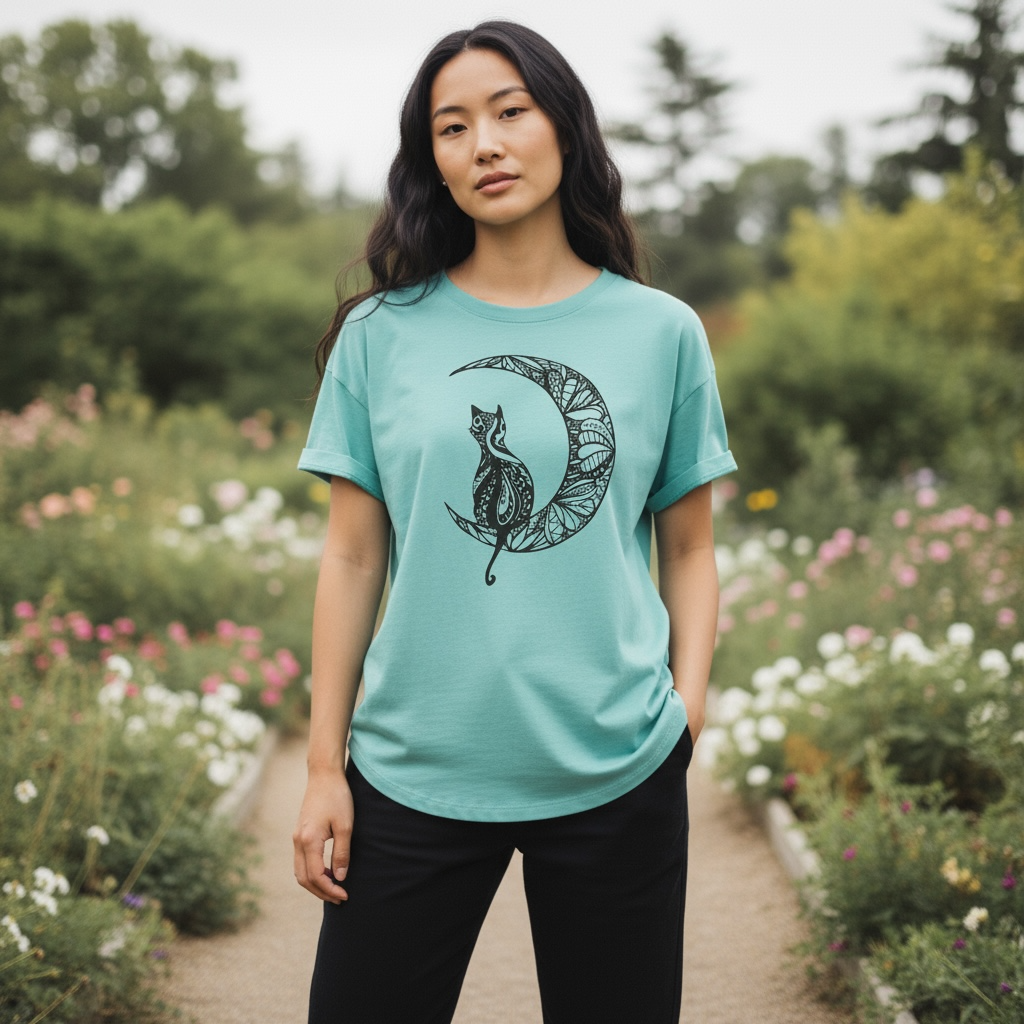 Polyester tee shirts, little stretch, fits true to size as a medium. Loose fit tee.