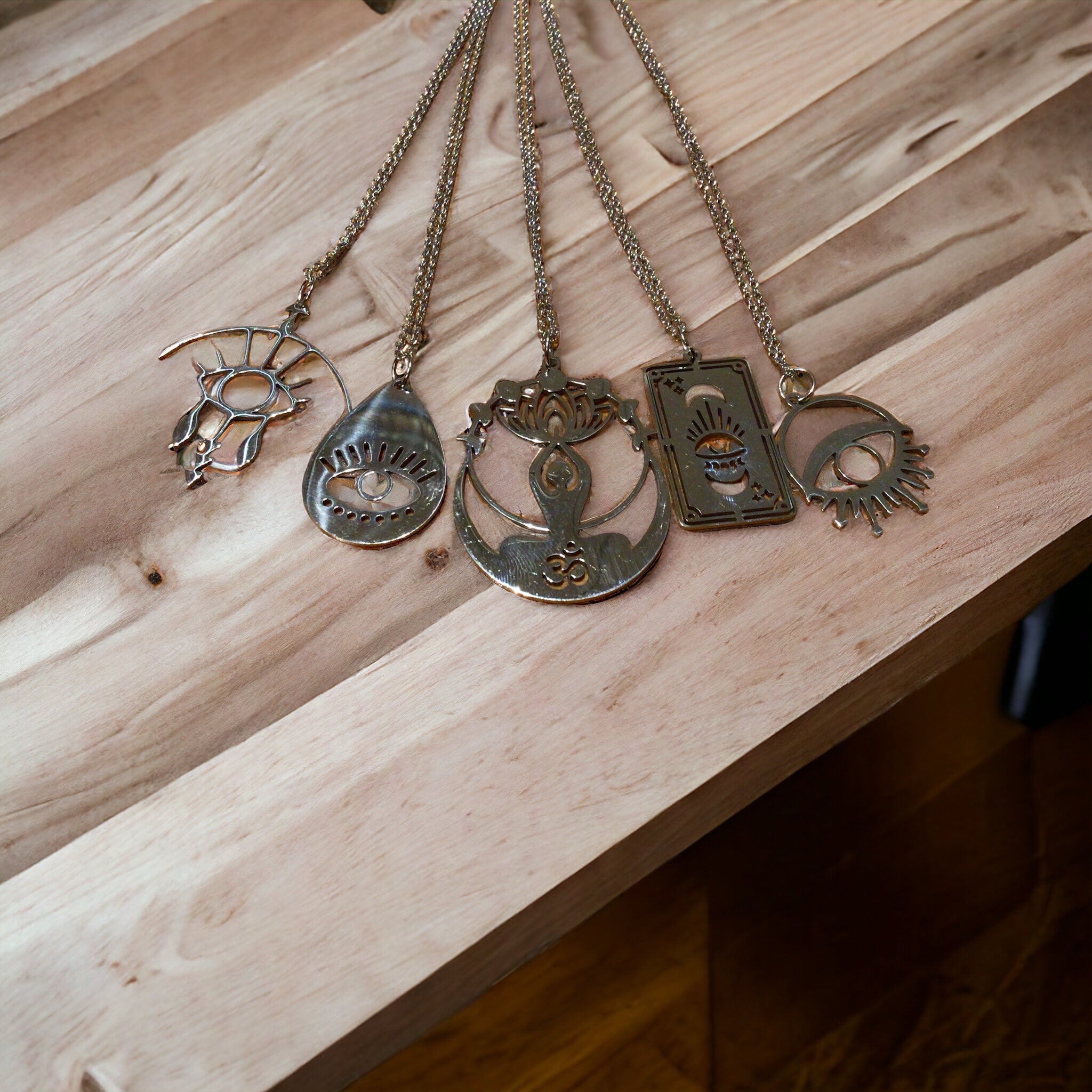 5 styles of evil eye protective charm, silver plated, 18” chain.